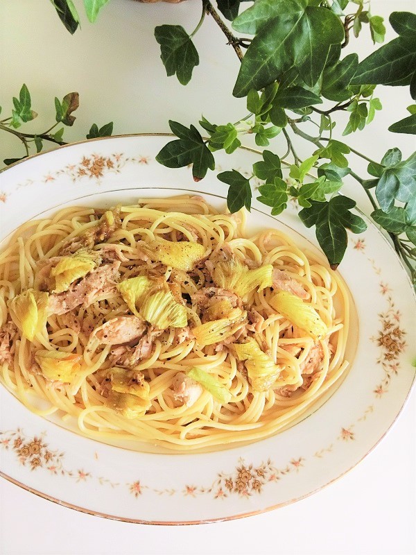 今回は、大好きな花おくらとツナのパスタを作りましたよ。